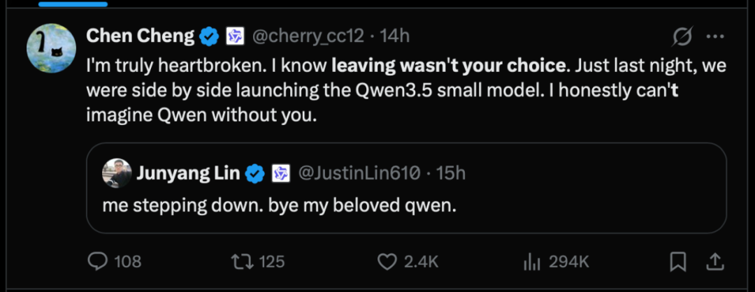 林俊旸发推后,Qwen团队的核心成员如Chen Cheng在下方回复:“我知道离开并非你的选择(leaving wasn't your choice)。”