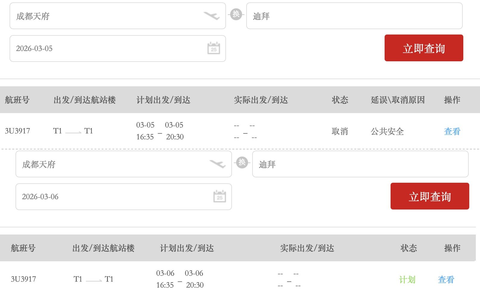 迪拜机场3月4日恢复运营后,3月5日,查询四川航空官网、飞常准、去哪儿等平台,从成都直飞迪拜的3U3917航班3月6日、7日及后续班期显示计划执飞状态,可购票,经济舱价格在4000元至6000元。而5日当天航班仍显示提前取消,取消原因是公共安全。该航班原本计划当天16:35起飞,当地时间20:30到达,全程飞行时间7小时55分钟。自中东局势紧张以来,该航线航班被多次取消。