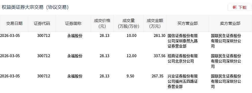 3月5日,永福股份大宗交易成交31.5万股,成交额886.21万元,占当日总成交额的1.99%,成交价28.13元,较市场收盘价30.87元折价8.88%。