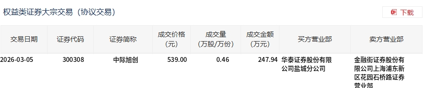 3月5日,中际旭创大宗交易成交4600股,成交额247.94万元,占当日总成交额的0.01%,成交价539元,较市场收盘价557元折价3.23%。