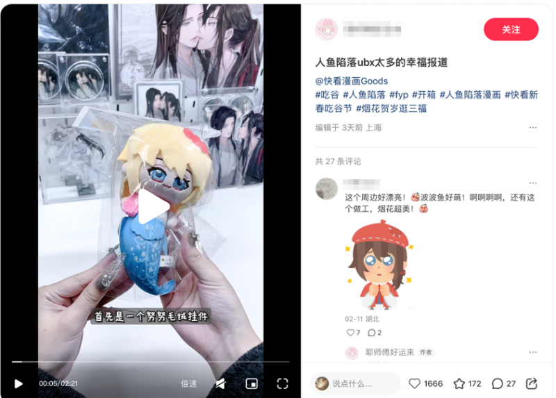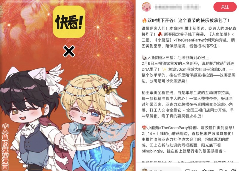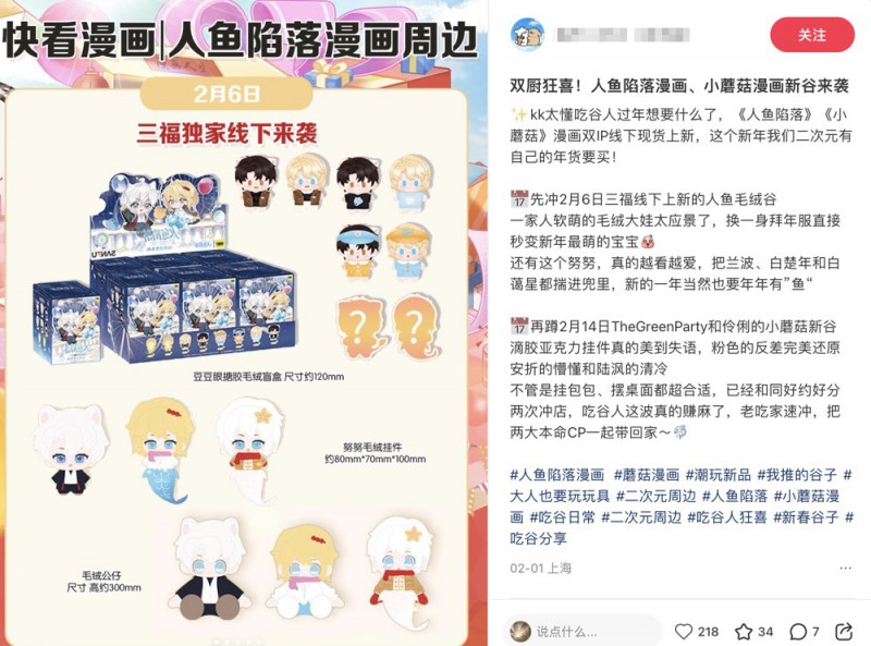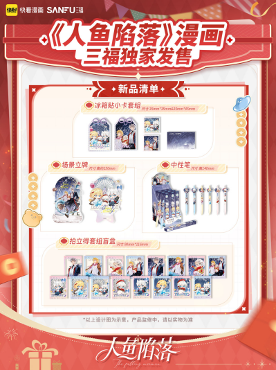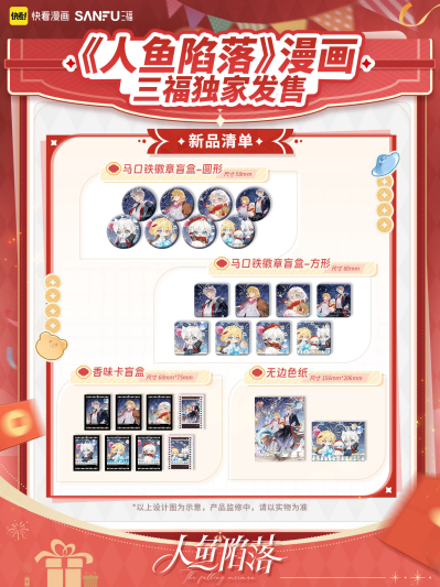 随着“谷子经济”持续升温,二次元IP周边正成为年轻消费市场的重要增长点。今年2月,快看漫画正式开启首届新春吃谷节,包括《人鱼陷落》《小蘑菇》《心动的分贝》《帮我拍拍》等10大高人气IP周边新品现货同步上线,并在1000多家线下门店集中发售。作为本次活动的核心IP之一,《人鱼陷落》凭借强大的粉丝基础与爆款周边表现,再次展现出优质漫画IP在消费市场中的巨大潜力。