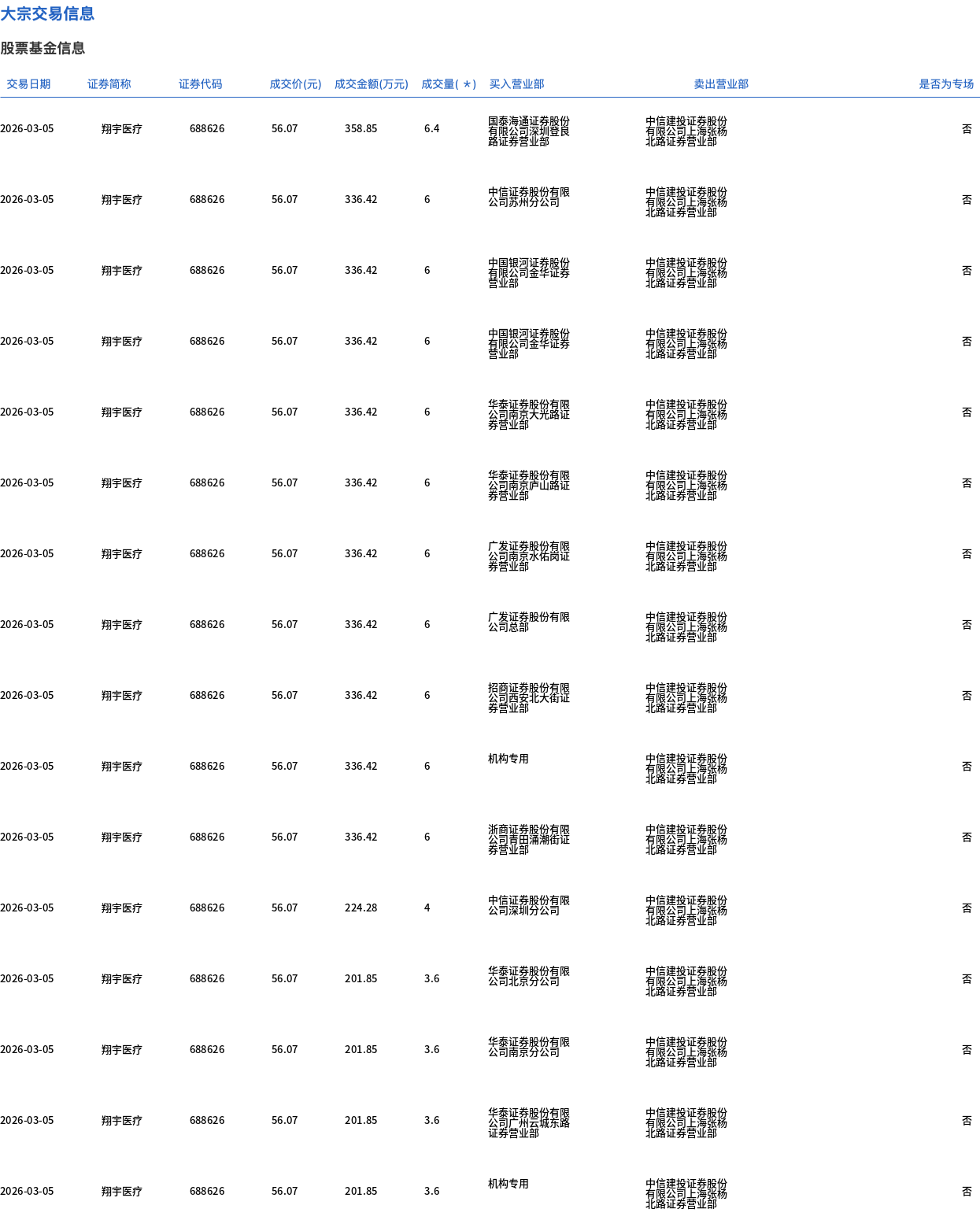 3月5日,翔宇医疗大宗交易成交84.8万股,成交额4754.73万元,占当日总成交额的16.63%,成交价56.07元,较市场收盘价62.98元折价10.97%。