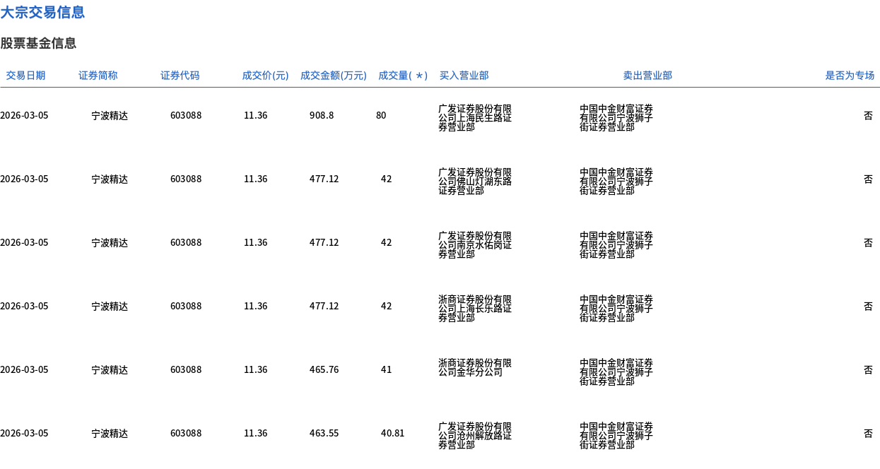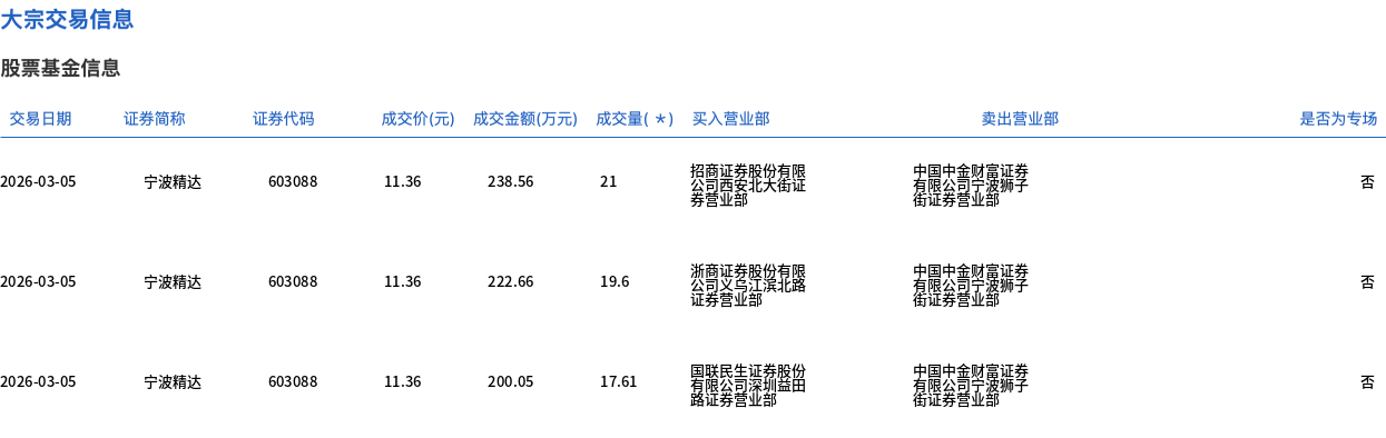 3月5日,宁波精达大宗交易成交346.02万股,成交额3930.74万元,占当日总成交额的15.36%,成交价11.36元,较市场收盘价12.66元折价10.27%。