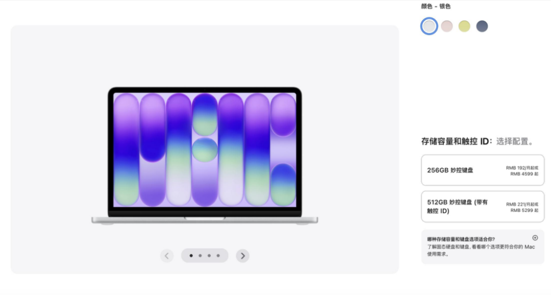 屏幕与机身方面,采用13英寸Liquid视网膜显示屏,支持10亿色彩、500尼特亮度,画质表现远超同价位Windows本;机身采用再生铝金属打造,重量仅1.2kg左右,轻薄易便携,同时推出银色、桃粉色、柑橘黄色、靛蓝色四款多彩配色,贴合年轻用户审美。