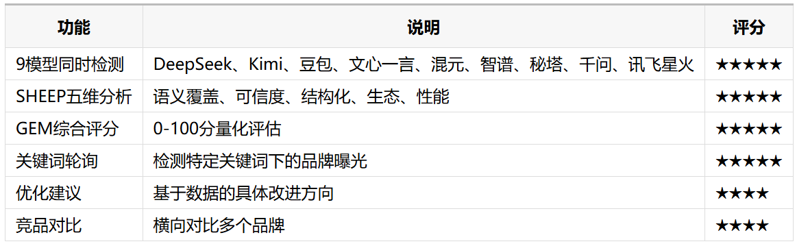 专注于国内AI搜索的品牌可见性诊断工具,基于独创的SHEEP框架进行五维评估。