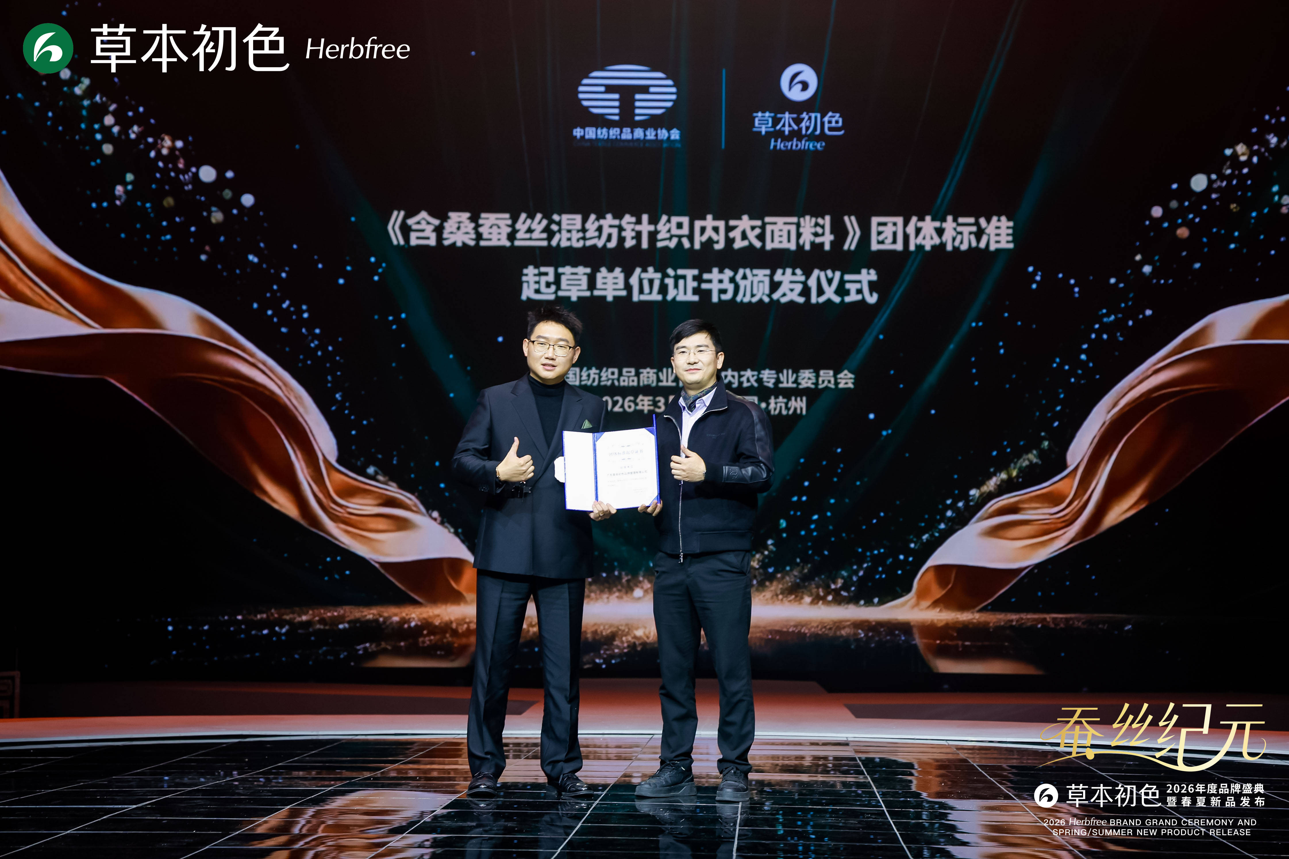 盛典现场的两大行业权威事件,标志着草本初色的行业地位与品质实力获得官方认可,也让品牌的行业标杆地位进一步夯实。品牌领衔起草《含桑蚕丝混纺针织内衣面料》团体标准起草单位证书,将以核心技术力量参与行业标准制定,推动桑蚕丝内衣行业的规范化、高品质发展;同时,新华社《中国名牌》揭牌仪式的隆重举行,中国纺织品商业协会秘书长王江波先生、浙江省服装行业协会会长郑念华先生、草本初色品牌代言人孙怡女士、草本初色品牌创始人陈培鑫先生、草本初色品牌联合创始人刘宝先生共同揭幕,标志着草本初色正式跻身中国优质名牌行列,权威背书的升级为品牌发展注入强劲动力。