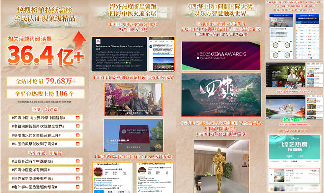 《四海中医》自开播以来,便以破竹之势席卷海内外传播平台,引发广泛关注与深度共鸣。节目上线全球180余个国家和地区,全网累计总传播量突破36亿,全站讨论量87.43万,登陆全平台热搜109次,持续位居微博综艺热度榜、爱奇艺纪录片热度榜等榜单前列。更值得关注的是其在品质与口碑上获得的双重认可,进入了《豆瓣2025评分最高纪录剧集》榜单。