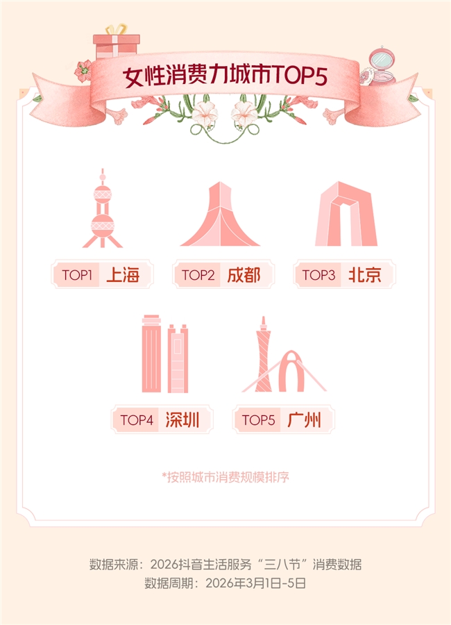 近日,抖音生活服务发布“三八节”消费前瞻数据,呈现节前平台女性消费偏好。数据显示,3月1日至5日,平台女性消费规模同比增长61%。体验式消费表现突出,其中拼豆、非遗手作、健身房、博物馆等抖音团购消费均实现数倍增长。