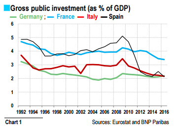 根据BNP PARIBAS的报告,这种下滑主要是源于基础设施的投资缺口。自1990年东西德合并的投资高峰后,德国的公共资产支出一直占据GDP的2.2%左右,与意大利、西班牙一起堪称欧盟最低。