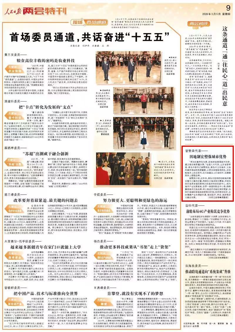 3月5日,《人民日报》“两会特刊”报道了多位“两会”代表委员的真知灼见。其中,全国人大代表,山东省委常委、青岛市委书记曾赞荣提出“因地制宜塑强城市优势”。他用“海洋、文旅、康养”三个关键词为青岛城市发展划出重点,并明确“坚持把经略海洋摆在重中之重的位置”。