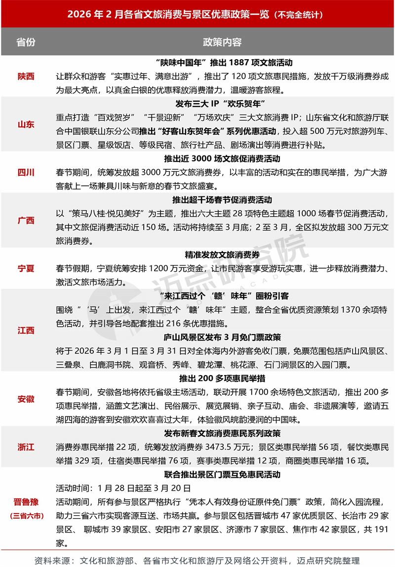 2月,恰逢中国农历新年,迎来超长春节假期,以陕西、山东、四川、广西等多个省份为代表,各地推出文旅促消费活动、精准发放文旅消费券与消费补贴、策划主题特色活动、发布跨区域联动景区互免政策等,加大优质文旅供给,激发假日文旅消费潜能,以实现“人气流量”与“经济收入”的量质齐升,为 2026年文旅产业高质量发展奠定坚实开局。如春节假期,浙江全域累计接待游客4604.3万人次,同比增长24.7%;实现全域旅游综合收入679.5亿元,同比增长26.5%;游客人均花费1475.8元,同比增长1.4%,创假日旅游抽样调查(2021年)以来同期新高。