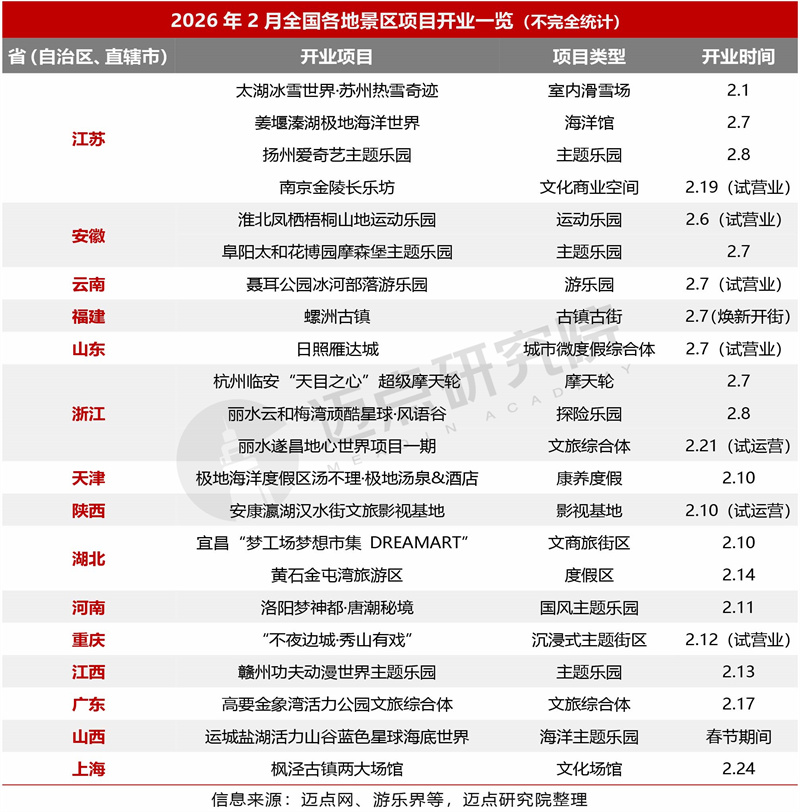 基于政策驱动与消费复苏下企业抢占市场的需求,2026年2月新开业景区项目呈现“华东领跑、业态多元、春节集中投放”的特征:区域上以江苏、浙江、安徽等华东省份为主,中西部亦有布局;业态上以主题乐园、沉浸式文旅商街区、特色游乐(室内滑雪、海洋馆、摩天轮等)为核心,强调体验与综合消费;开业节奏集中于春节前后,精准对接消费高峰。