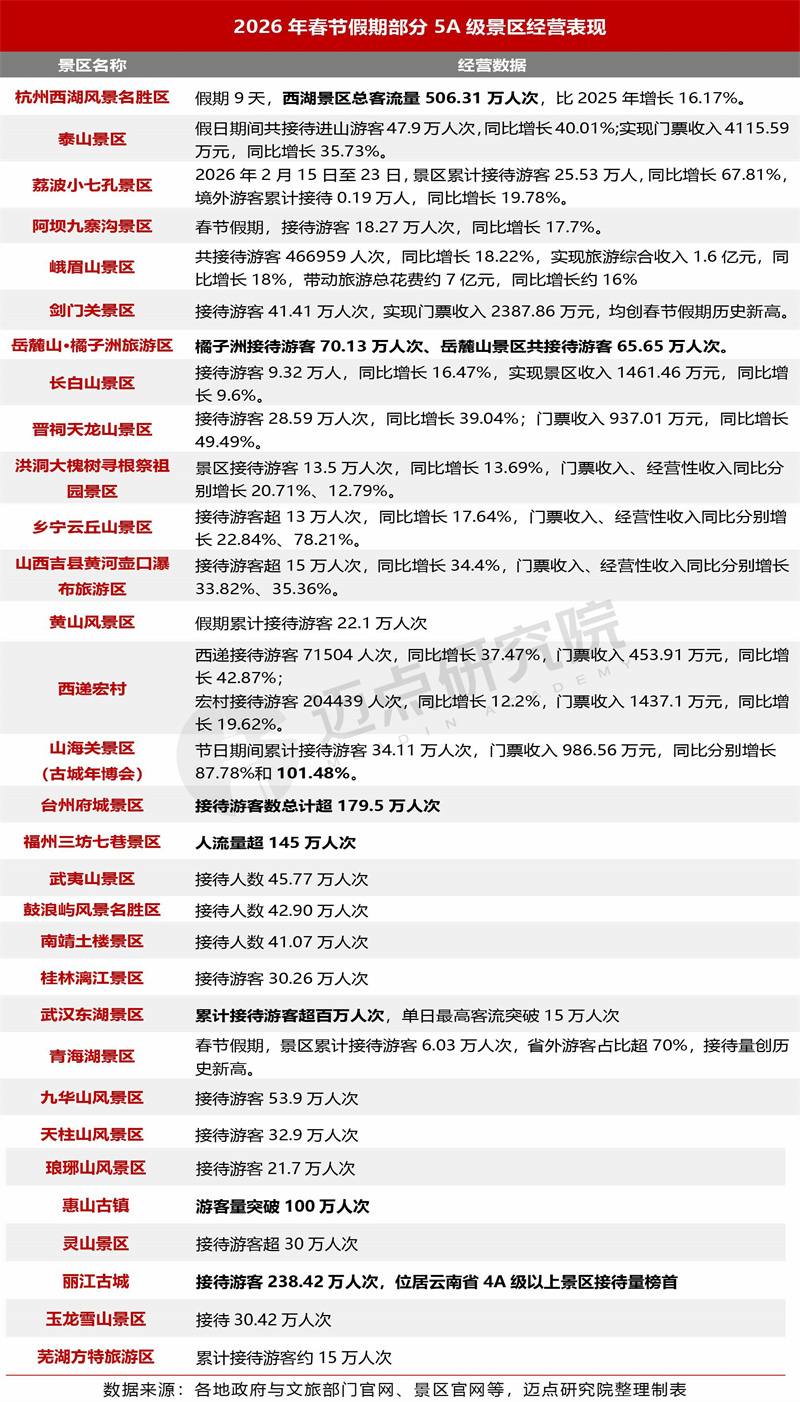 2026年春节被誉为“史上最长春节假期”,共放假9天,“旅游过年”成为新风尚。全国各地景区通过免票与优惠折扣、精彩纷呈的非遗年俗活动、沉浸式演艺体验、细致周到的服务等方式引客流、促消费,多个景区客流规模创纪录、同比增速亮眼,市场复苏强劲。例如,以杭州西湖、岳麓山·橘子洲、台州府城、福州三坊七巷、武汉东湖、惠山古镇、丽江古城等为代表的5A级景区接待量突破百万,以杭州西湖、泰山、荔波小七孔、阿坝九寨沟、峨眉山、长白山、晋祠天龙山、洪洞大槐树寻根祭祖园、乡宁云丘山、西递宏村、山海关等为代表的十余家5A级景区游客接待量同比呈“双位数”增长。此外,景区客流结构优化,如青海湖景区省外游客占比超 70%,显示出长线出游需求与目的地吸引力增强。