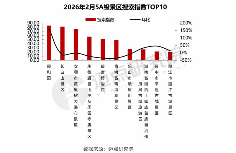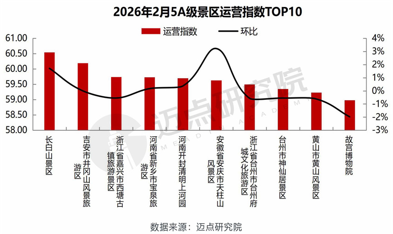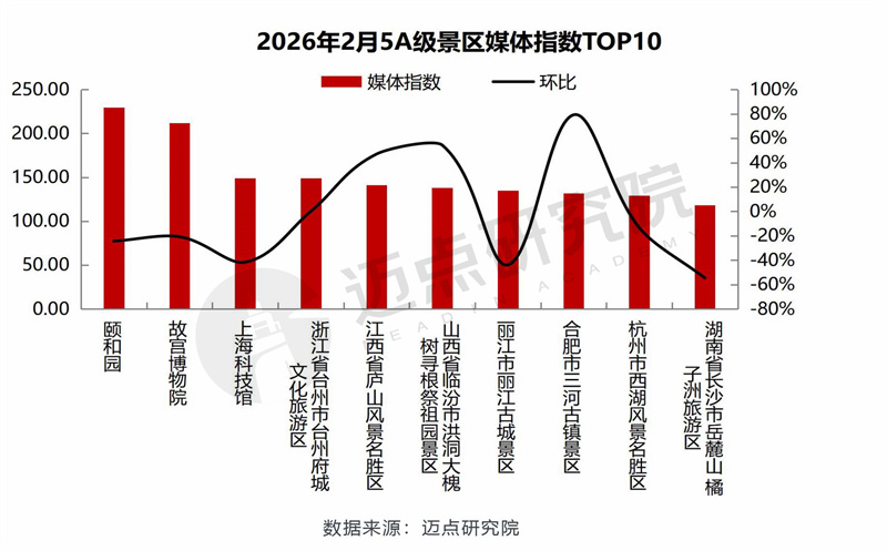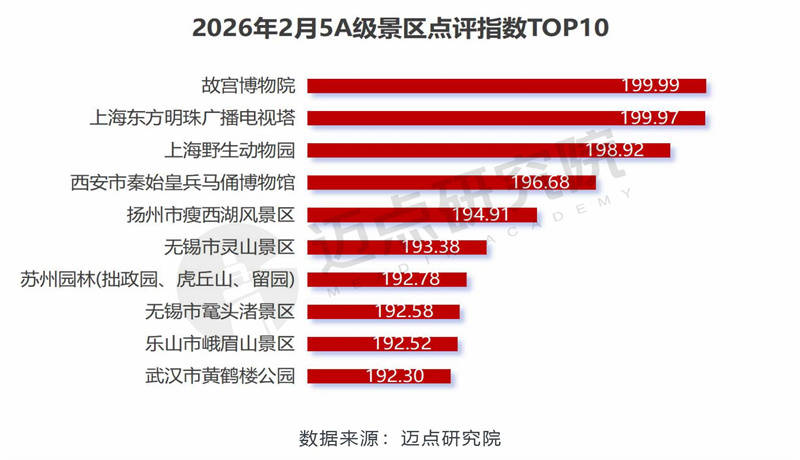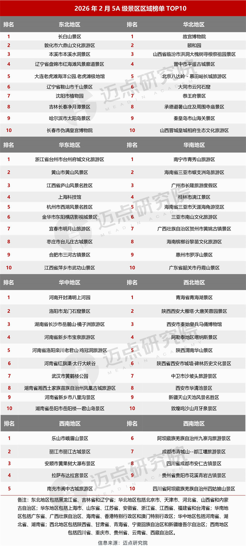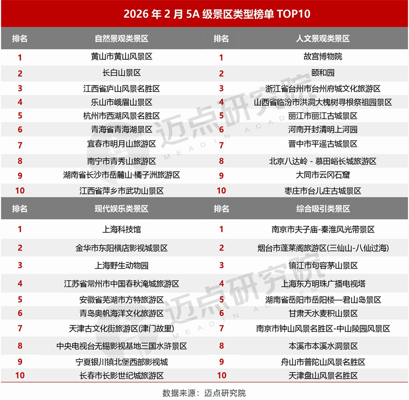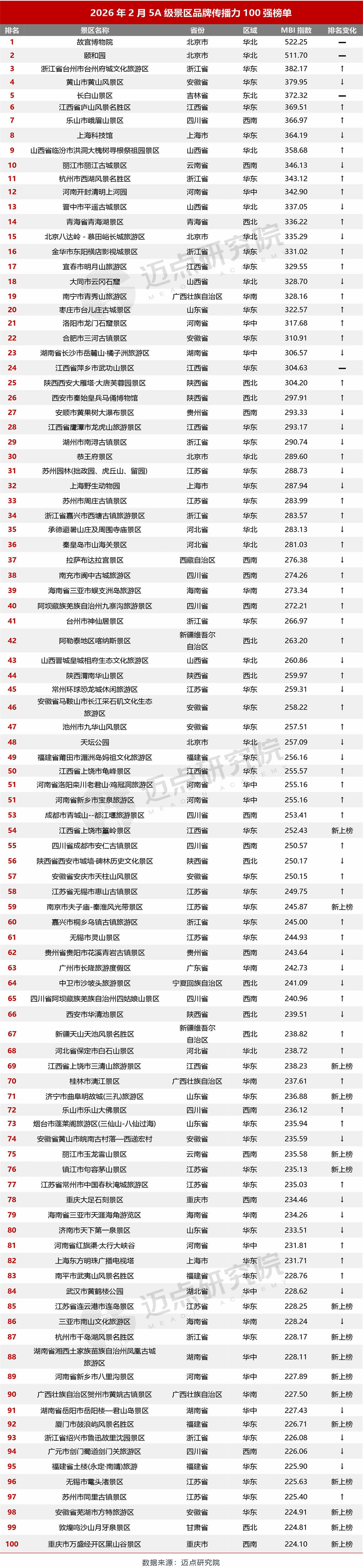 以下是迈点研究院独家发布“2026年2月5A级景区品牌传播力(MBI)100强榜单”。2月,故宫博物院、颐和园、浙江省台州市台州府城文化旅游区、黄山市黄山风景区、长白山景区、江西省庐山风景名胜区、乐山市峨眉山景区、上海科技馆、山西省临汾市洪洞大槐树寻根祭祖园景区、丽江市丽江古城景区位列榜单前十。本月百强景区中,排名环比上升47家、环比下降33家、排名保持不变的4家、新上榜16家。