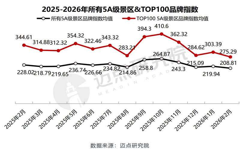 经迈点研究院监测,2月所有5A级景区的品牌指数均值为208.81,环比下降5.06%;100强5A级景区MBI品牌指数均值为275.29,环比下滑9.26%。指数回落主要受春节假期景区营销投放与传播延迟、市场注意力向城市休闲与新兴目的地分流等因素影响;展望后续,随着天气回暖,春季踏青、赏花游等相继到来,叠加多地景区推出免票、优惠等引流举措,头部与优质5A级区品牌指数有望逐步企稳回升。