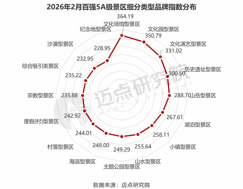 2026年2月,百强5A级景区细分类型品牌指数位列前五的依次为文化场馆型景区、文化园型景区、文化演艺型景区、历史遗址型景区、山岳型景区,其中,文化园型景区、文化演艺型景区品牌指数环比增长相对突出,凭借游客互动体验、浓厚节庆氛围、年俗活动的创新呈现等,进一步放大该类景区品牌的传播力与吸引力。