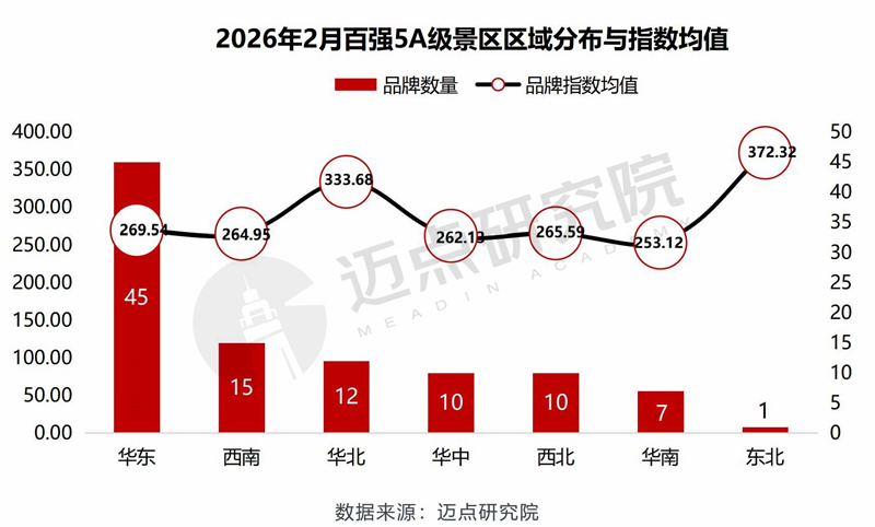 2026年2月,5A级景区各区域百强品牌数量环比变动:华东地区增4席、华中地区增2席、西南地区增1席,华北地区数量未变动,东北地区减4席、西北地区减2席、华南地区减1席,总体变动较明显,全国各区域景区竞争激烈,华东地区凭借优质资源与营销发力持续领跑。