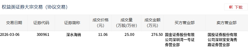3月6日,深水海纳大宗交易成交25万股,成交额276.5万元,占当日总成交额的4.33%,成交价11.06元,较市场收盘价14.35元折价22.93%。