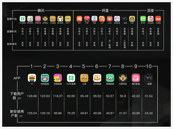 现阶段我们看一下直播有什么特点。这张图看上去比较复杂,但其实挺简单的,这边是中国互联网最强的互联网公司在直播端的投入,有一些是他们自己做的产品,有一些是他们投资的,或者是收购的。那边是目前按照下载用户量的数据进行的排名,这里面有非常有名的,比如映客,花椒,还有垂直类的,比如斗鱼等等,映客这种就是平台类的,还包括腾讯NOW直播。