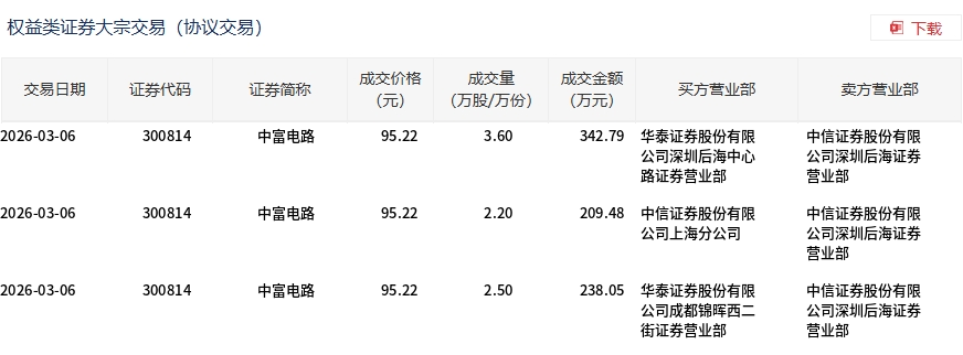 3月6日,中富电路大宗交易成交8.3万股,成交额790.32万元,占当日总成交额的0.69%,成交价95.22元,较市场收盘价108.21元折价12%。