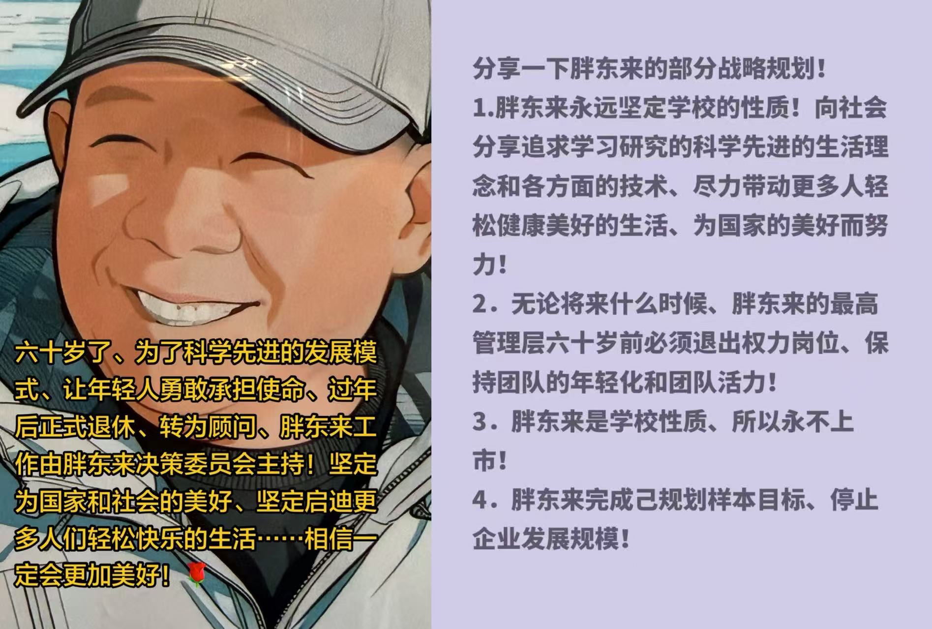 大概在于东来的视角下,这次退休是胖东来公司与他自己的一场“双赢”:公司减少了受自己影响的风险,自己也能全力“分享人类科学美好的生活方式方法”。