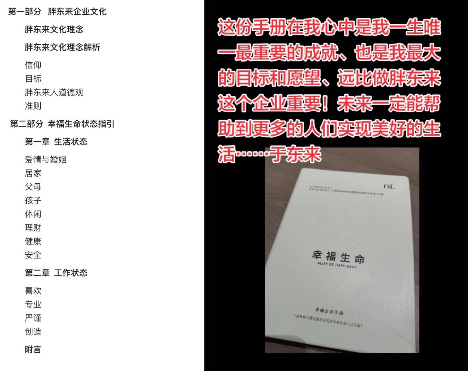 于是,“自由·爱”(自由 平等 博爱),这句标语自此后出现在胖东来的商场和购物袋上。胖东来的官网甚至为此发布了一篇4万多字的《幸福生命手册》,阐述了于东来所提倡的价值观细则。