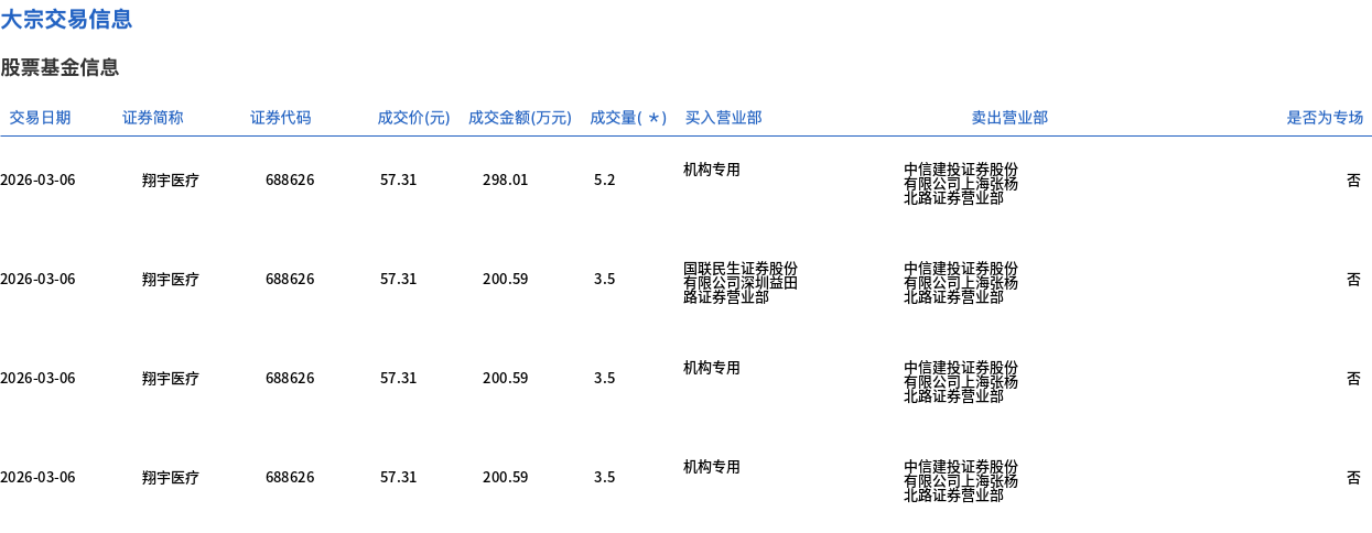 3月6日,翔宇医疗大宗交易成交22.68万股,成交额1299.8万元,占当日总成交额的5.92%,成交价57.31元,较市场收盘价63.98元折价10.43%。