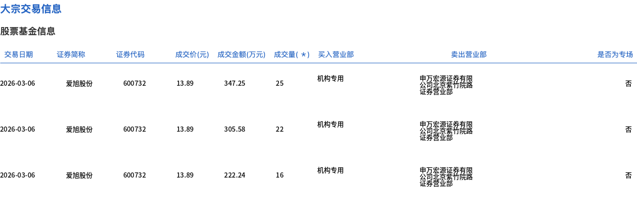 3月6日,爱旭股份大宗交易成交63万股,成交额875.07万元,占当日总成交额的1.15%,成交价13.89元,较市场收盘价15.1元折价8.01%。