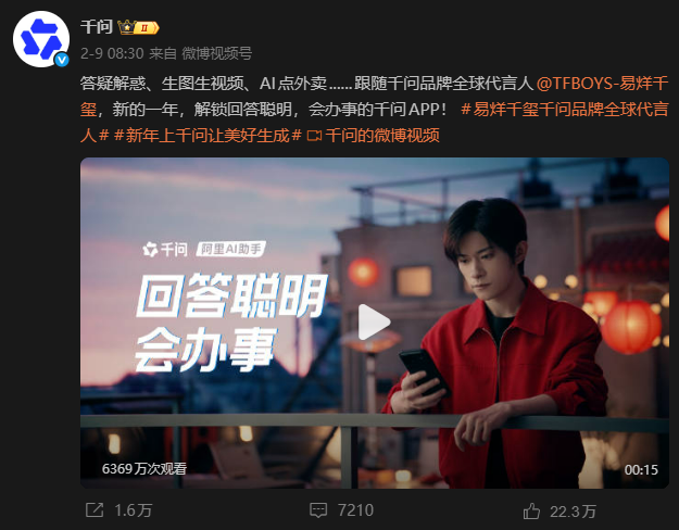 2月6日,阿里千问与淘宝闪购联动,启动“春节请客计划”,用户通过千问直接向淘宝闪购下单,每人可以获得25元免单优惠券,在活动首日当天,该活动产生的订单数达到1500万单,而千问 App日活规模一度达到7500万。