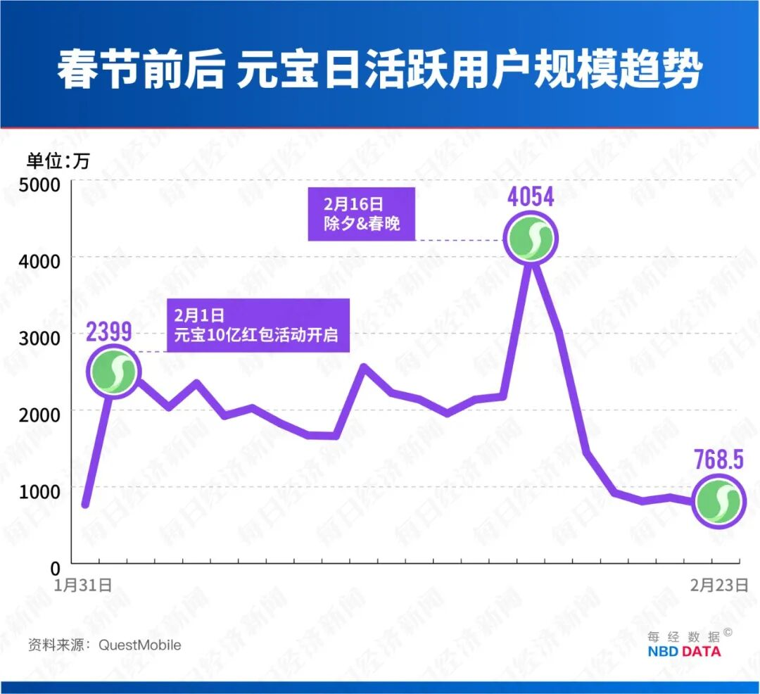 2月23日,QuestMobile监测数据表明,三家日活均出现大幅度下滑:豆包从除夕1.45亿的峰值下滑到1.03亿,下滑幅度超过28%;千问日活只有3200万左右,相较活动期间的峰值几近“腰斩”;元宝日活只有768万,相较除夕当日跌幅超过八成,直接回到了春节红包前的日活水平。