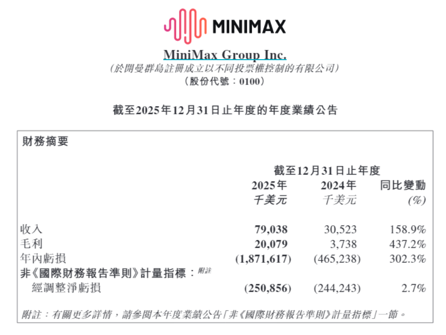 3月2日,Minimax披露了上市后的首份完整年度财报。公司2025年实现营收7903.8万美元,同比大增158.9%;毛利2007.9 万美元,同比飙升437.2%;与此同时,公司年内净亏损18.72 亿美元,同比扩大302.3%;经调整净亏损为2.51亿美元,同比微增2.7%。