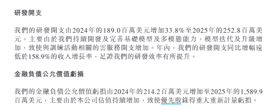 相比之下,现在的Minimax要更注重“烧钱”的效率:研发投入增速放缓,同时也下调了营销的预算(2025年其销售及分销开支从8700万美元降至5190万美元),刨除股份支付、优先股公允值变动的损失后,2025年Minimax经调整净亏损2.5亿美元,相比2024年的2.44亿美元亏损小幅扩大。