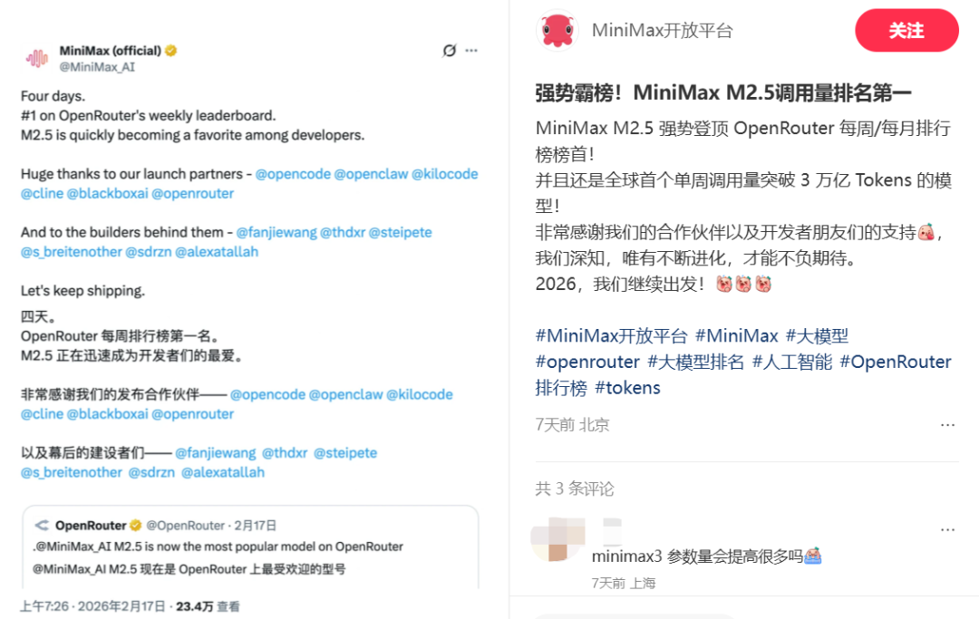 API调用或许是推动Minimax B端狂飙的第一功臣。“趣解商业”注意到,最近,MiniMax M2.5 的调用量登顶了OpenRouter每周/每月排行榜榜首;在2月9日至15日这一周,OpenRouter平台总调用量激增的3.21万亿Token中,仅M2.5这一款模型就贡献了1.44万亿Token的增量。此外,2026年前两个月M2系列模型的调用量已飞速增长,已达到去年12月的六倍。