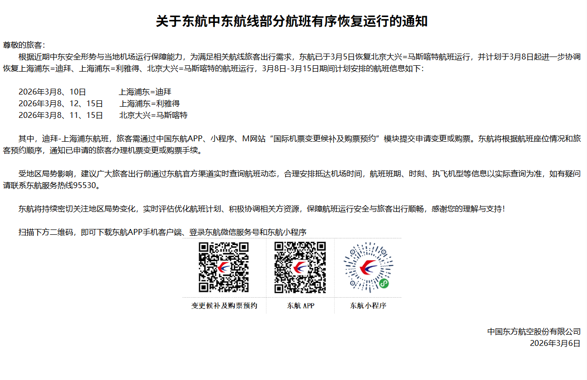 3月6日,东方航空发布通知,将有序恢复东航中东航线部分航班。