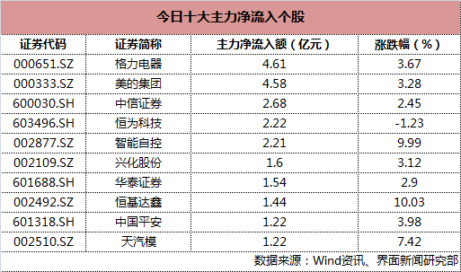 今日家电行业板块获主力资金热捧,格力电器(000651.SZ)、美的集团(000333.SZ)领衔今日十大主力净流入个股,其主力净流入分别为4.61亿元、4.58亿元。此外,券商股今日出现强势攀升,中信证券(600030.SH)、华泰证券(601688.SH)均跻身个股主力净流入前十,分别为2.68亿元、1.54亿元。