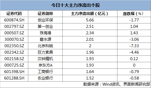 雄安概念股则遭遇下挫,在十大主力净流出个股中,一半席位由雄安概念股占据。其中,创业环保(600874SH)、碧水源(300070.SZ)、北京科锐(002350.SZ)、巨力索具(002342.SZ)、汉中精机(002158.SZ)等遭主力抛售力度较大,其主力净流出额分别为5.66亿元、2.01亿元、2.00亿元、1.96亿元、1.93亿元。