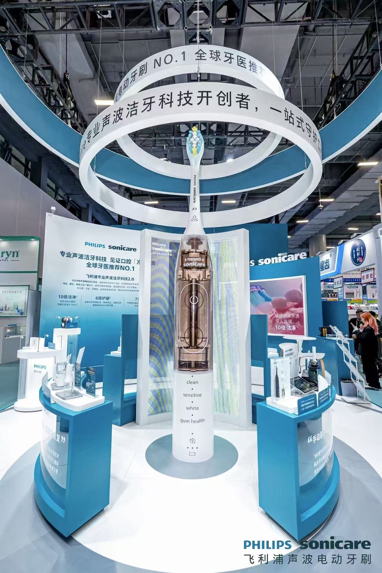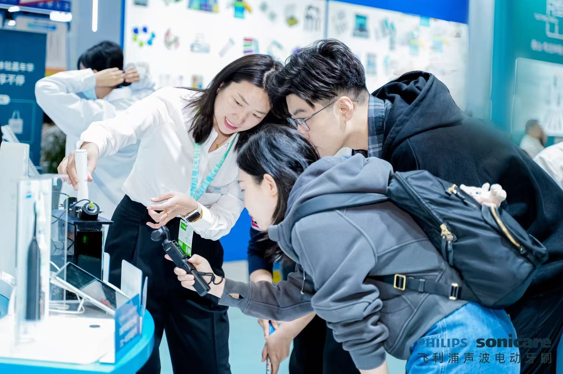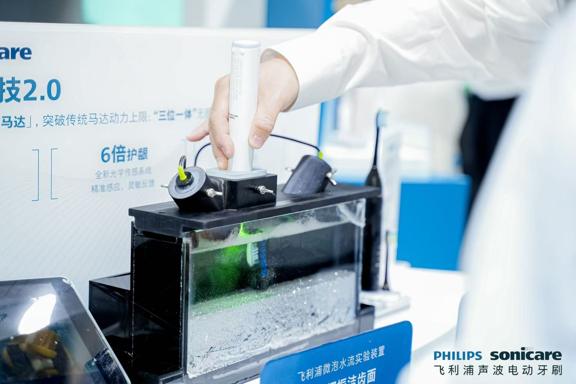除了带来突破性的洁牙科技与重磅新品,飞利浦更以全矩阵专业口腔健康解决产品,打造覆盖日常需求的专业解决方案。本次华南国际口腔展现场,飞利浦带来沉浸式体验展台,设置微泡水流装置、产品试刷区等体验环节,让来宾亲身感受前沿科技的清洁实力。不是所有的声波电动牙刷都能形成有效的微泡水流,飞利浦在现场通过微泡水流实验装置,模拟演示出飞利浦电动牙刷通过三位一体高频振动,驱动微泡水流,可轻松渗透齿缝、牙龈线等难刷部位。在产品试刷区,无论是大师刷的细腻触感,还是专业冲牙器的强劲水流,都可试用体验。现场还有专业人员提供一对一口腔护理指导,帮助观众科学认识日常清洁习惯,传递“口腔护全身”的健康理念。从产品体验到理念普及,飞利浦展台成为展会现场的一大亮点。