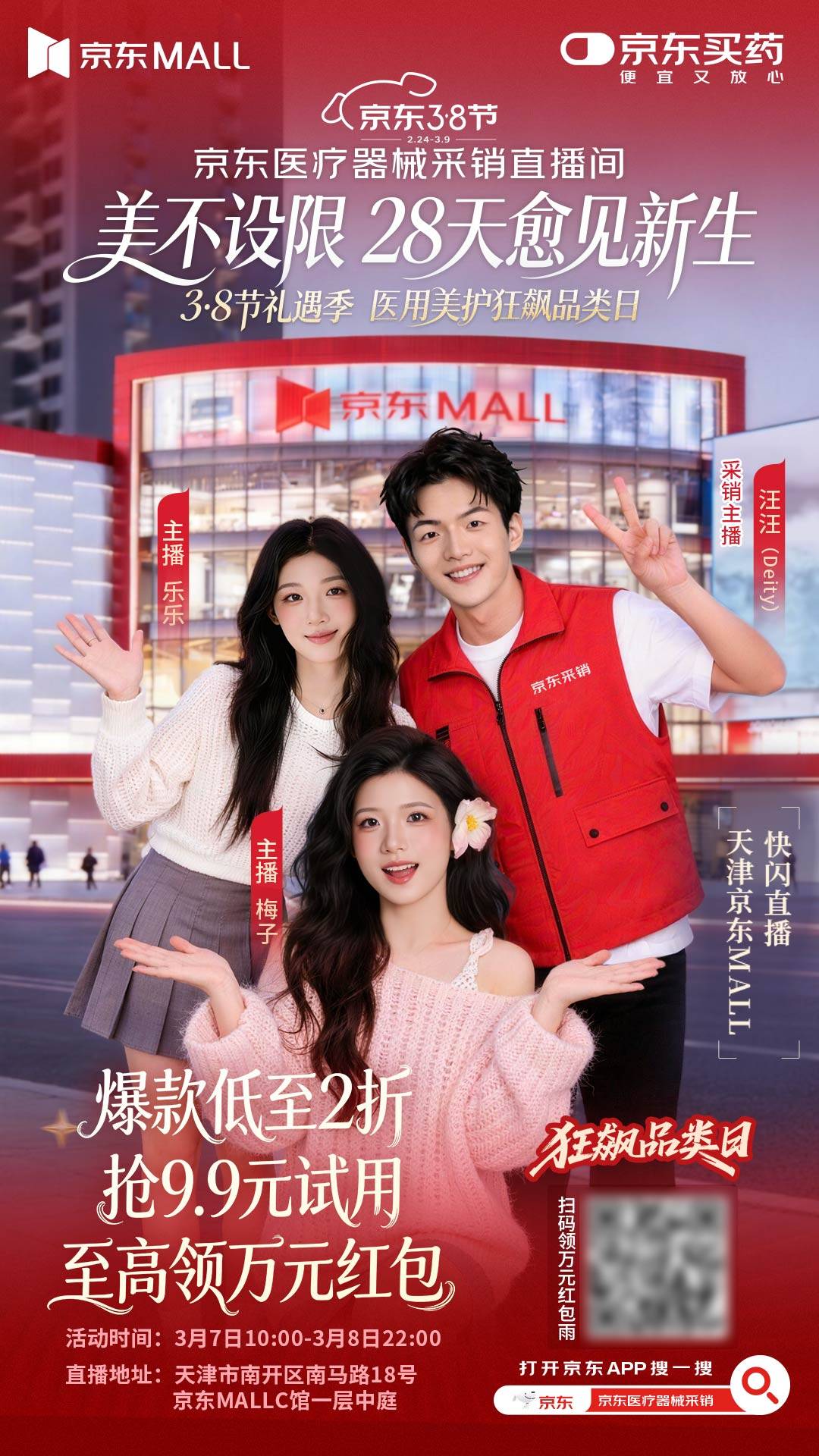3月7日至8日,线下快闪活动同步在天津京东MALL举行。现场除产品外,还可体验京东健康自主研发的AI测肤工具,该工具可基于超亿级医患对话数据和千万级疾病图片库,精准分析修复问题并生成可视化档案,为用户提供个性化产品推进与改善建议。此次活动在京东医疗器械采销直播间进行专场同步直播,让未能亲临现场的全国用户也能“云逛”快闪店,直观了解产品与修复知识,享受专属直播福利。