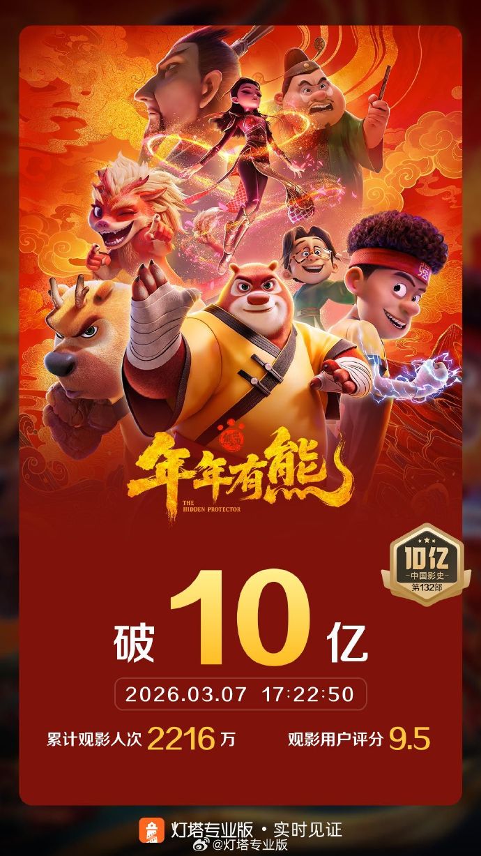 据灯塔专业版实时数据,截至3月7日17时22分,影片《熊出没·年年有熊》票房突破10亿。