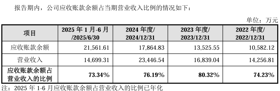 只不过,不少业绩只是“纸面富贵”。报告期内,公司应收账款分别为1.06亿元、1.35亿元、1.79亿元和2.16亿元,占当期营业收入的比例分别为74.23%、80.32%、76.19%和73.34%(已年化)。