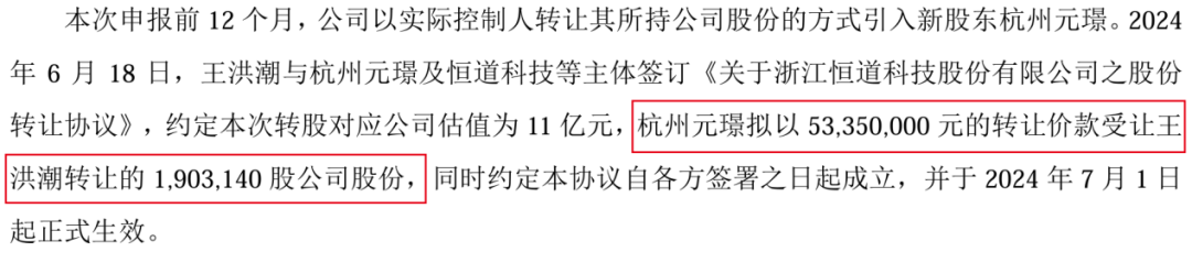 此后,恒道科技没有通过增资方式引资,而是王洪潮以转让股权的形式套现。递表北交所前半年(2024年6月),王洪潮向杭州元璟转让190.31万股公司股份(对应4.85%股权),套现5335万元。