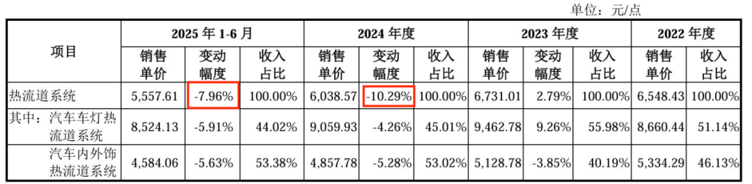 招股书显示,恒道科技的热流道系统已经在降价。2022年至2025年上半年(以下简称:报告期),公司热流道系统的平均销售单价分别为6548.43元/点、6731.01元/点、6038.57元/点和5557.61元/点。