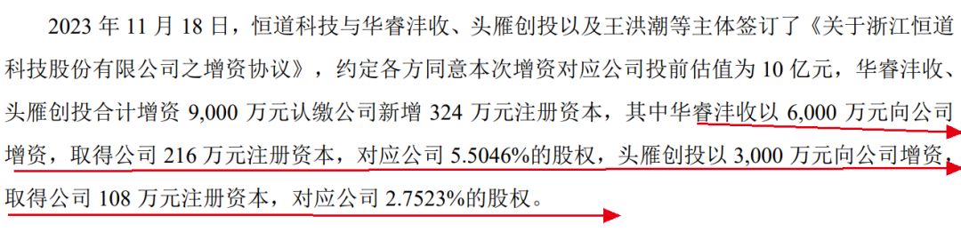又过了3年(2023年11月),恒道科技再次引入外部投资者。其中,华睿沣收以6000万元认购公司216万元注册资本,对应5.5046%股权;头雁创投以3000万元认购108万元注册资本,对应2.7523%股权。