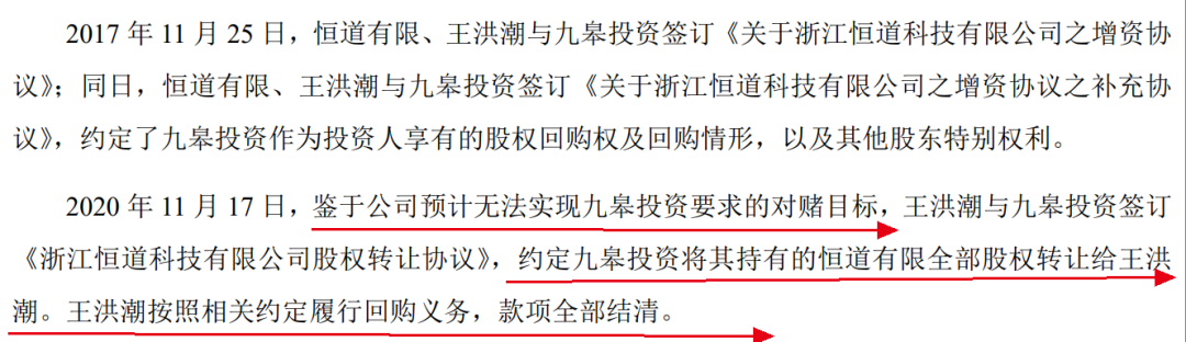 2017年11月,恒道有限、王洪潮与九皋投资签订相关增资协议,约定了九皋投资享有的股权回购权及回购情形。