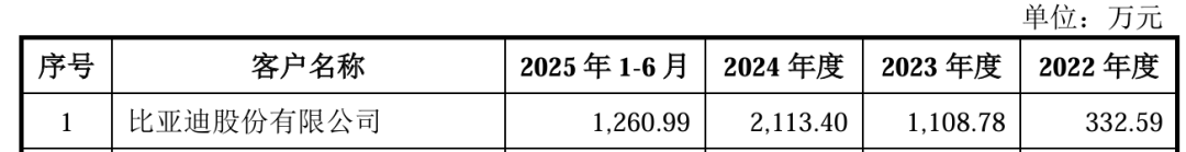 到2023年时,比亚迪一跃成为公司第一大客户,销售额大涨233%至1108.78万元。此后,比亚迪站稳了第一大客户的位置。
