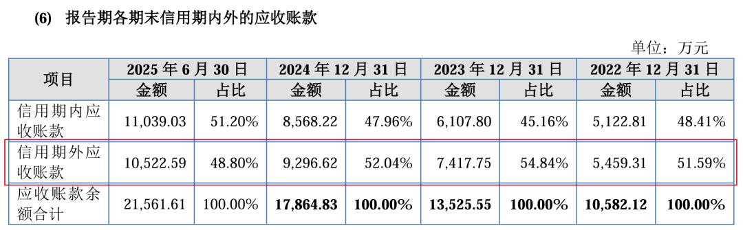 实际上,恒道科技约一半应收账款已经逾期。报告期内,逾期应收账款占总应收账款的比例分别为51.59%、54.84%、52.04%和48.80%。