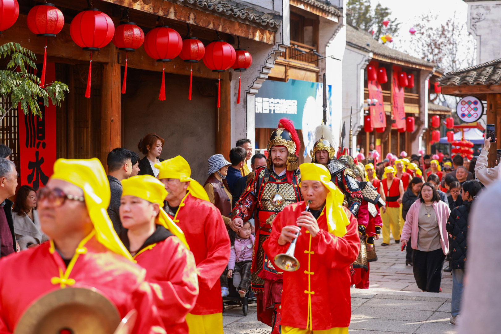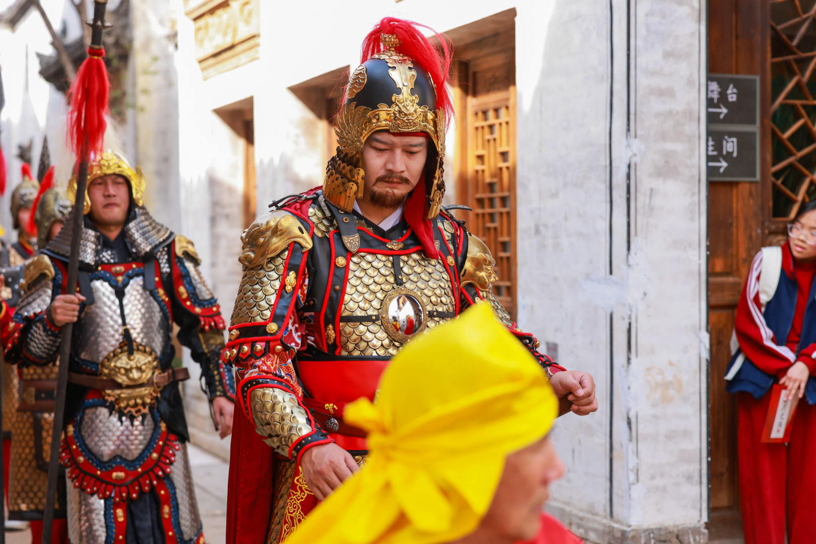 巡游现场,气氛热烈而庄重,成为一场凝聚民心、激发爱国情怀的盛会。伴随着激昂的鼓点,身着金甲、手持兵器的戚家军将士们迈着整齐的步伐,从西门老街戚家公祠出发,沿着古街缓缓前行,他们身姿矫健、目光坚定,一举一动间尽显戚家军的铁血风范;沿街两侧,群众自发驻足观看,掌声、欢呼声此起彼伏,不少群众手持小红旗,高声呐喊“忠勇报国”“家国安康”,眼中满是崇敬与自豪。孩子们身着迷你铠甲,模仿着将士们的姿态,在人群中穿梭,小小的身影里,承载着对忠勇精神的向往与传承;老人们驻足凝视,追忆着戚家军的英雄事迹,诉说着义乌兵的忠勇传奇,岁月的沧桑与精神的传承在此刻交织共鸣。这场巡游,既是“跟着春晚游义乌,带着喜乐逛西门”系列新春活动的重要组成部分,更是一次生动的爱国主义教育,让每一位参与者都在沉浸式体验中,感悟忠勇精神的力量,厚植家国情怀,凝聚起“心往一处想、劲往一处使”的强大合力。