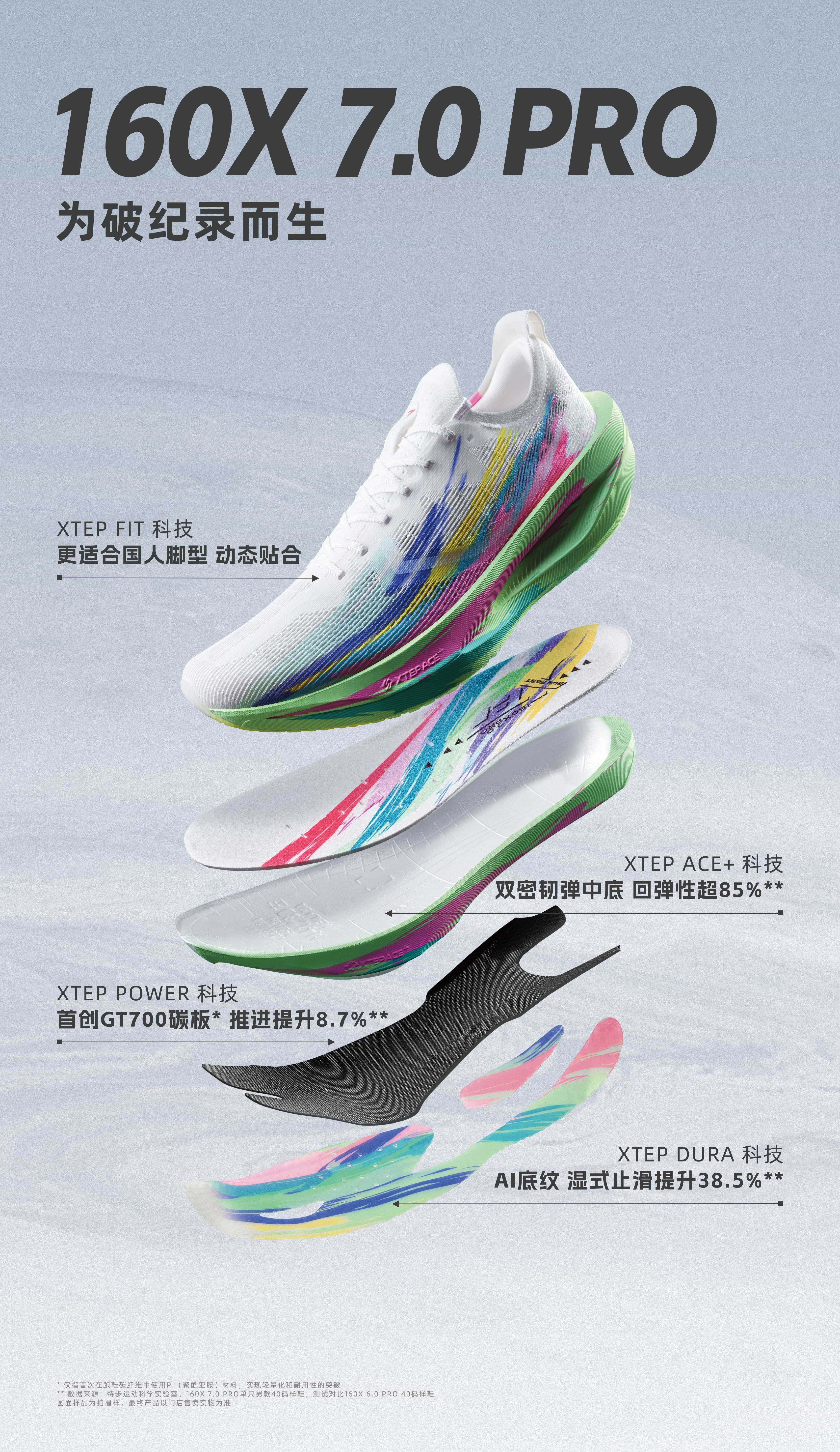 其中XTEP FIT科技采集超过30万份脚型数据,建立起中国最大的脚型数据库,从而让跑鞋更适合国人脚型。XTEP DURA科技首创使用马拉松级的CPU材料,并借助AI大模型对大底纹路进行科学精准的参数化设计,实现耐磨、防滑、轻质的完美统一。升级的XTEP ACE+科技,则实现更低的密度、更快的回弹,更加优异的抗压缩形变能力,确保性能持久不衰减。特步独有的XTEP POWER科技矩阵,创新性地将航天材料PI纤维、玄武岩纤维等创新材料应用于跑鞋领域,助力跑者速度更进一步。