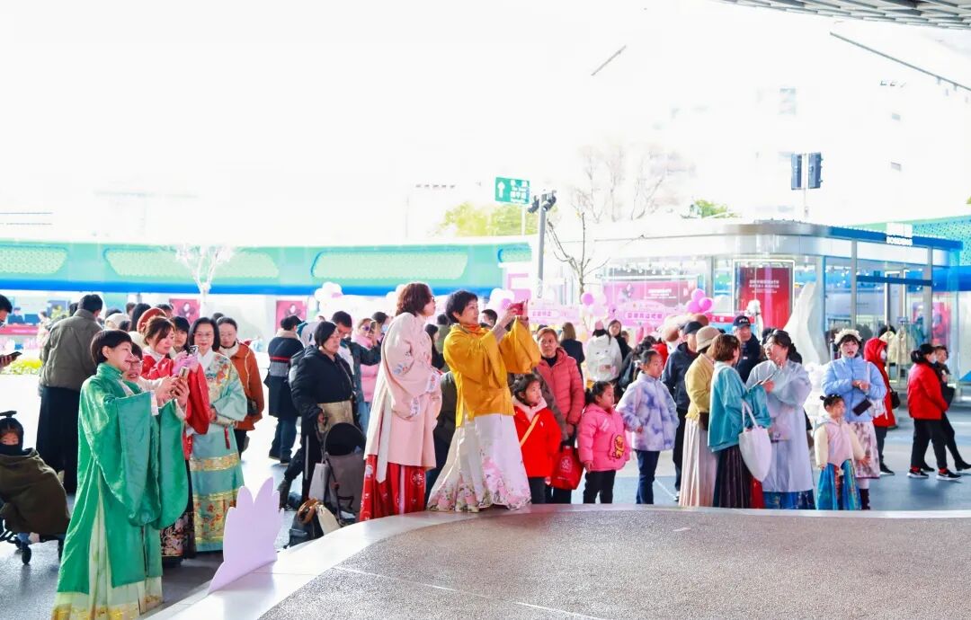 舞台之下,同样是一幅浪漫的春日图景。在“她创繁花”春会市集上,众多市民换上了飘逸的汉服,穿梭在古色古香的摊位间。从非遗竹编到宋代点茶,从投壶验巧到花钿绘制,流动的国风让整个商圈化作了沉浸式的“国潮打卡地”。
