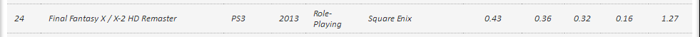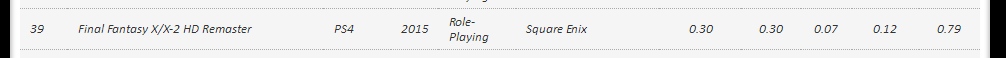另两部作品 FF10/FF10-2 于2015年推出了PS4的1080P高清重制版,是国内80、90代的玩家在媒体杂志上最常见的一部FF祖品,比如说女主人公尤娜就曾被玩家成为童年的女神。因此SE推出国行铁盒版的FF10重制版,在国内销量非常好,VGchart数据显示全球销量为79万套。并且这两部作品在2013年就被重制过一次了,PS3版本全球销量127万套。SE在同样一部作品上获得了3次营收,这也是他被称为冷饭大厂的原因。